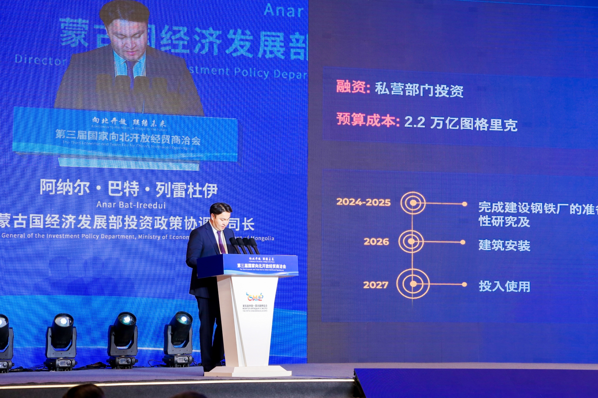 现在,请蒙古国经济发展部投资统一政策协调司司长阿纳尔·巴特·列雷杜伊作经济形势与发展项目推介,掌声欢迎。