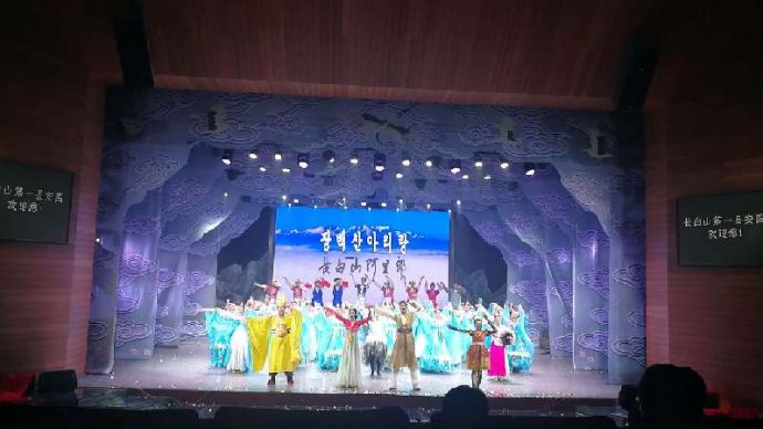 在素有“长白山下第一镇”“美人松故乡”之美誉的安图县二道白河镇,采访采风活动成员欣赏大型原创歌舞剧《长白山阿里郎》。