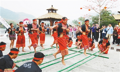 黎族民间艺人在昌化江畔木棉观景台为游人表演竹竿舞。 苏晓杰 特约记者 林朱辉 摄