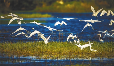 昌江的好生态引来不少野生动物栖息。图为翱翔在昌江海尾湿地公园的鹭鸟。 苏晓杰 摄