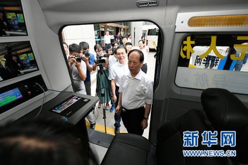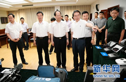 宁夏回族自治区党委书记石泰峰(右一)在新华社宁夏分社参观新华网无人机直播车。新华社发(刘泉龙 摄)