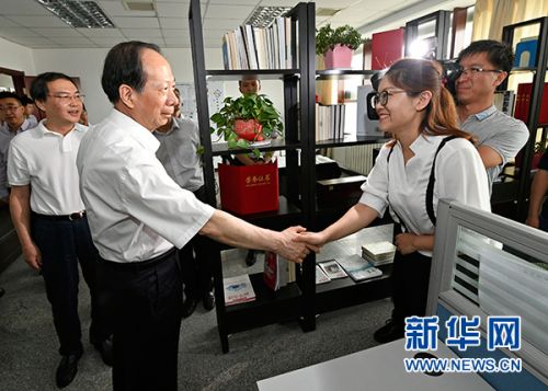 宁夏回族自治区党委书记石泰峰(左二)在新华社宁夏分社调研报道情况。新华社记者 王鹏 摄