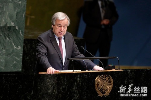 6月4日,在位于纽约的联合国总部,联合国秘书长古特雷斯祝贺尼日利亚常驻联合国代表提贾尼·穆罕默德-班德当选第74届联合国大会主席。新华社记者 李木子 摄