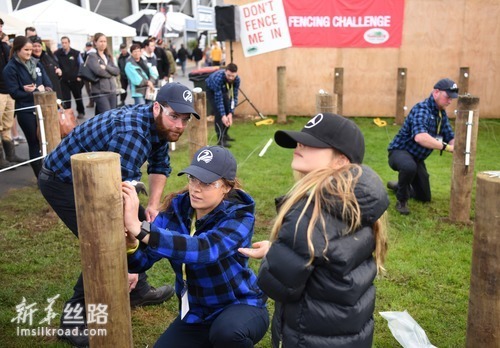 6月12日,在新西兰汉密尔顿举行的第51届国际农业博览会上,一名女孩参与筑栅栏演示活动。新华社记者 郭磊 摄