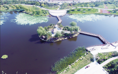 位于长春南部新城的兰桡湖公园,是长春近年打造的一座精品文化主题公园。公园占地面积12.85公顷,包括入口景观区、植物造景区、水上观景区等六大景区,其中水景面积2.31公顷。园林部门还结合园区地形地貌特征,设置了景观长廊、园林路、木栈道、停车场、儿童活动区等场所和设施,满足人们休闲活动需求。图为航拍兰桡湖公园全貌。 李成伟 摄