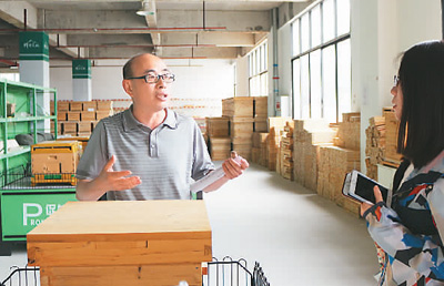 图为蜂谷美地公司副总经理姚长兴向记者介绍养蜂器具。