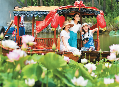 时下,随着气温持续攀升,山东省枣庄市台儿庄国家运河湿地公园大面积的荷花盛开,花色娇艳,碧绿的荷叶繁茂如盖,粉嫩的花儿亭亭玉立,或含苞待放,或竞相盛放。湿地荷花别样红,为景区增添许多美色,吸引不少市民和游客前来观赏。图为6月13日游人乘船在湿地公园赏荷。