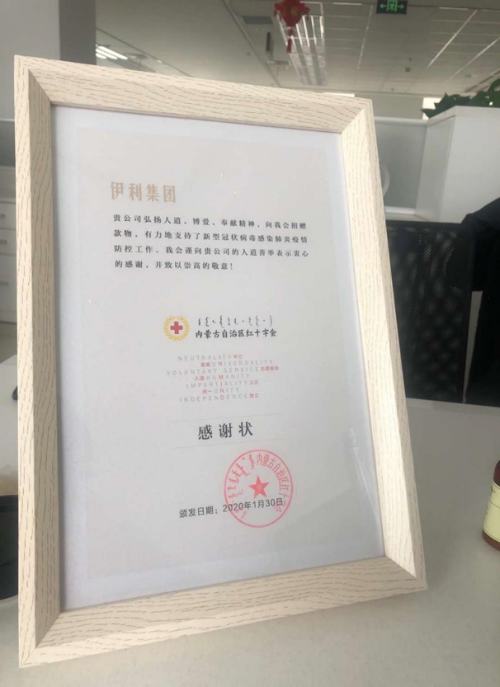 图为内蒙古自治区红十字会向伊利集团颁发的感谢状
