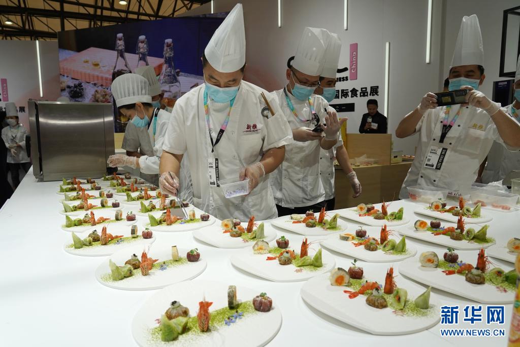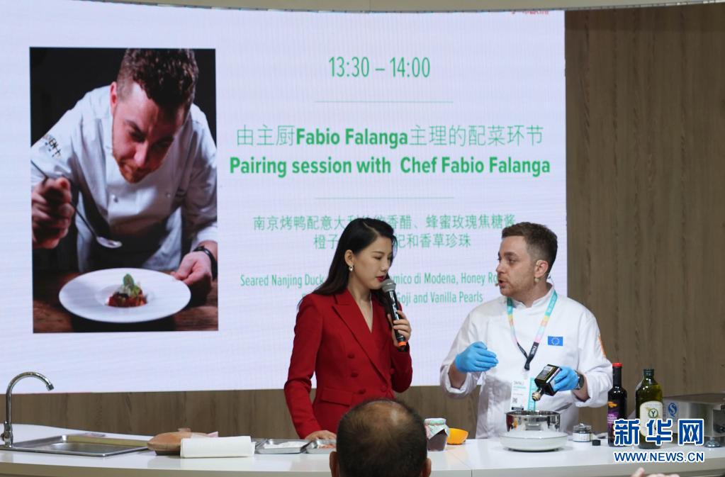5月18日,意大利厨师在展会现场直播制作“混搭”中意食材的美食。 当日,第二十二届中国国际食品和饮料展览会在上海新国际博览中心开幕。 新华社记者 任珑 摄