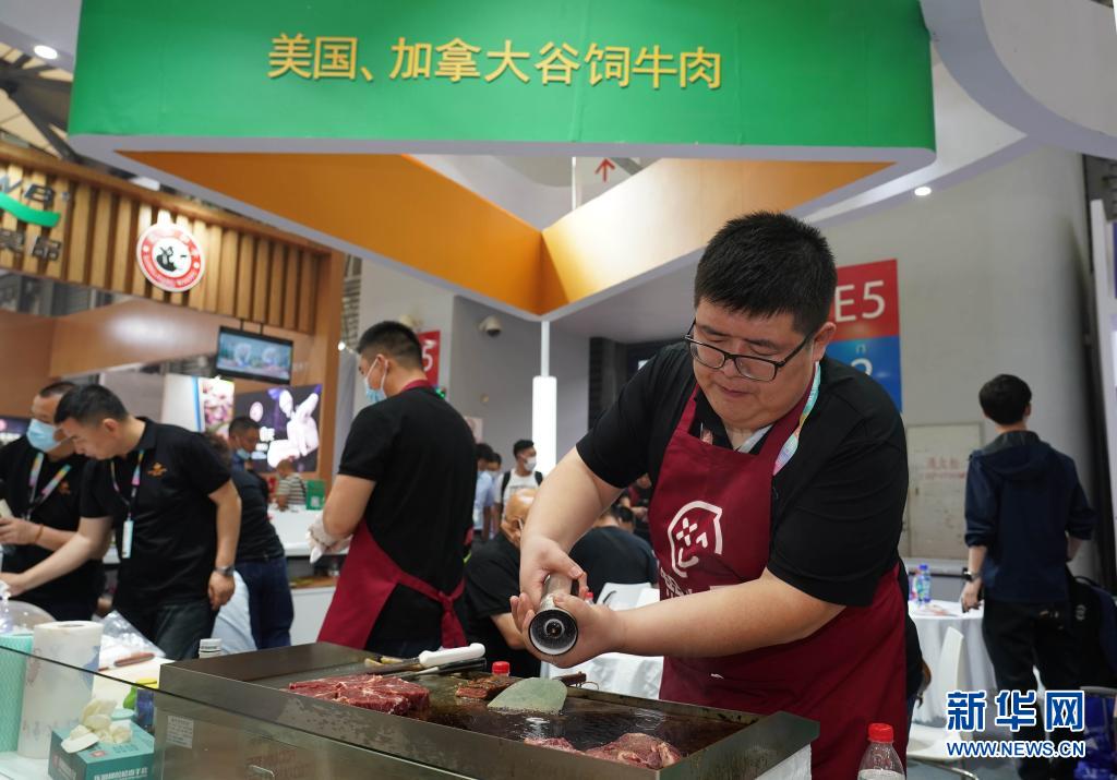 5月18日,展商在现场烹饪进口牛排。 新华社记者 任珑 摄