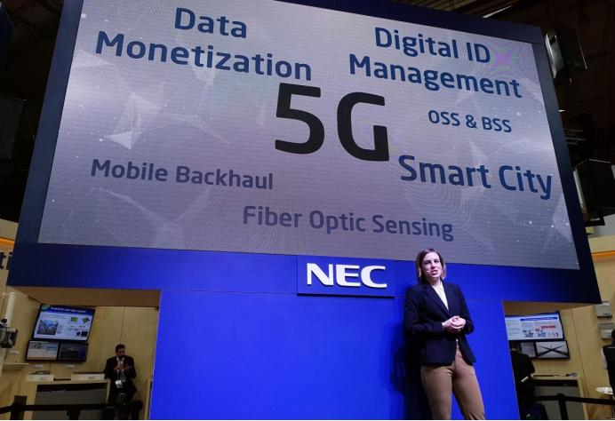 资料图。2019年2月26日,曾经的世界半导体巨头日本NEC在西班牙巴塞罗那举行的移动世界大会(MWC 2019)上进行关于其5G项目的演讲。新华社郭求达摄。