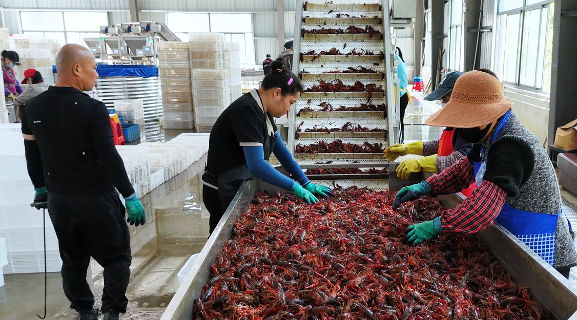 刚被捕捞上岸的小龙虾,将立即送往附近的盛典休闲生态园科创中心进行分拣和打包。近期,盛典休闲生态园科创中心引进了一台新“装备”,可自动为小龙虾称重,小龙虾只需“坐”上传送带,就可以将它们按大、中、小规格进行智能分拣,然后再进行打包和装运。“智能分拣设备的引进,使分拣人工数压缩到了原来的1/3,不仅可以提高小龙虾分拣效率,还可以避免人工分拣造成的小龙虾质量不一、大小不一的情况。从人工分拣向机器分拣的转变,加快了小龙虾送至各地餐桌的时间。”盛典生态休闲园的负责人李典中介绍道。盛典休闲生态园科创中心建有大型冷藏仓储间,冷链汽运、空运的双渠道运输也为龙虾储藏和运输的成活率提供了有力的保障。近至长三角,远至乌鲁木齐,都可以确保24小时内小龙虾新鲜到货。