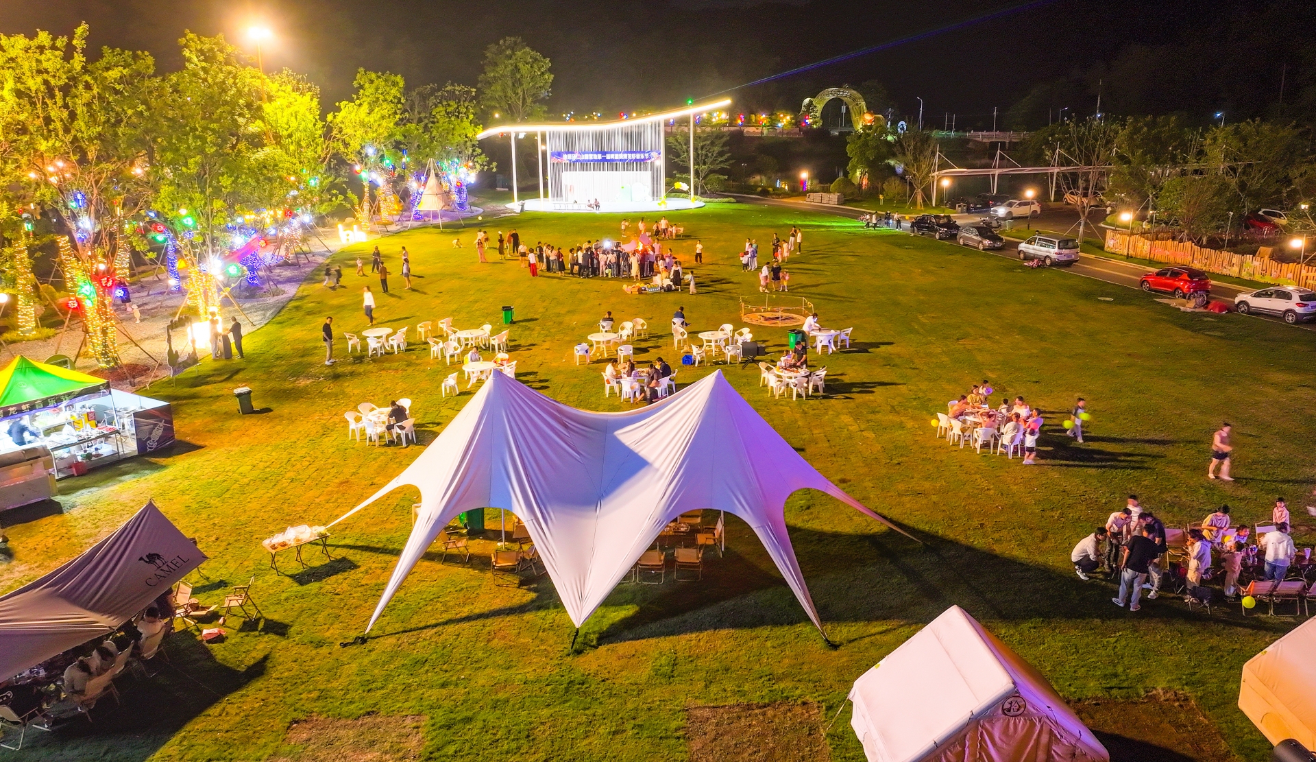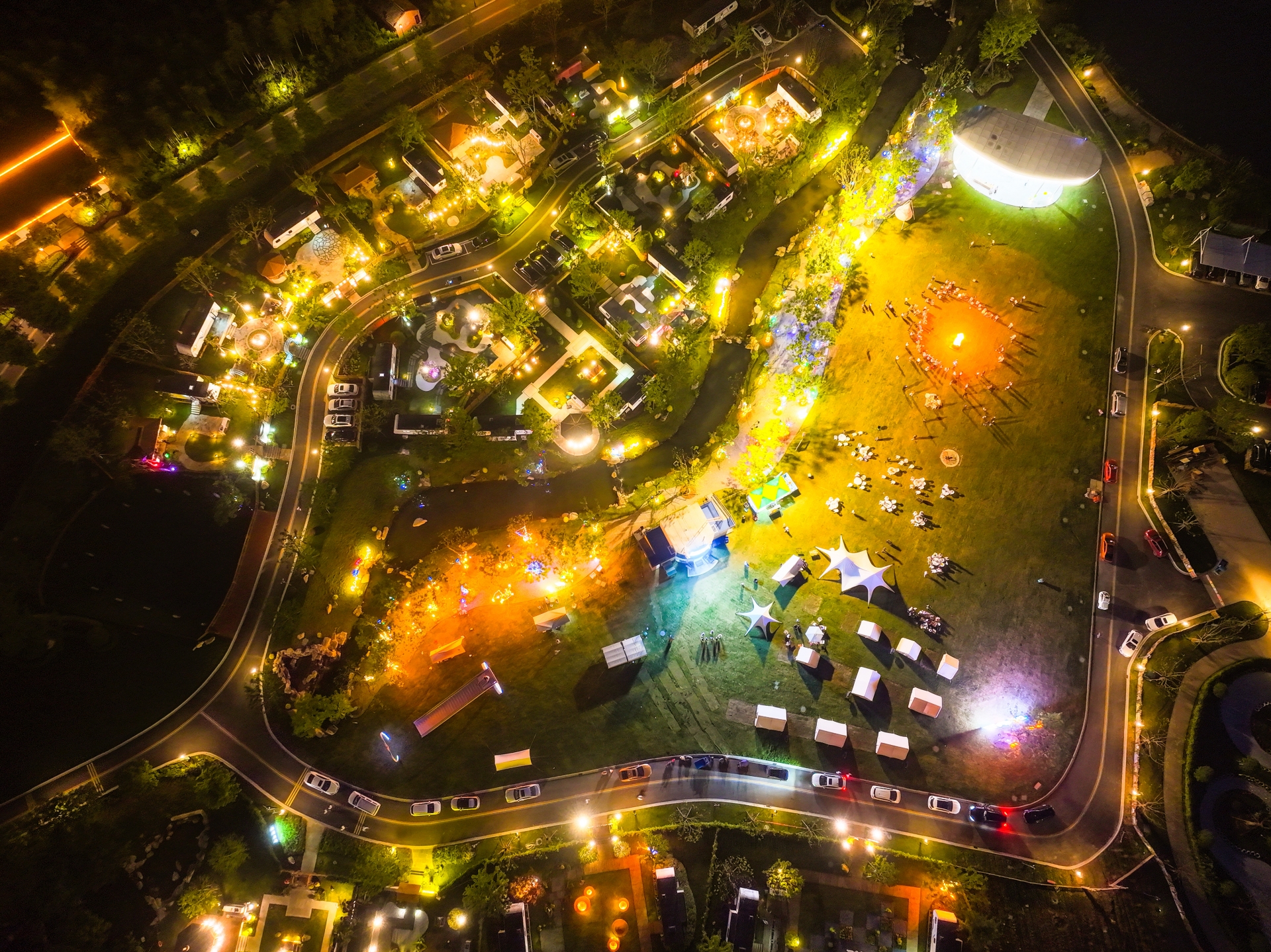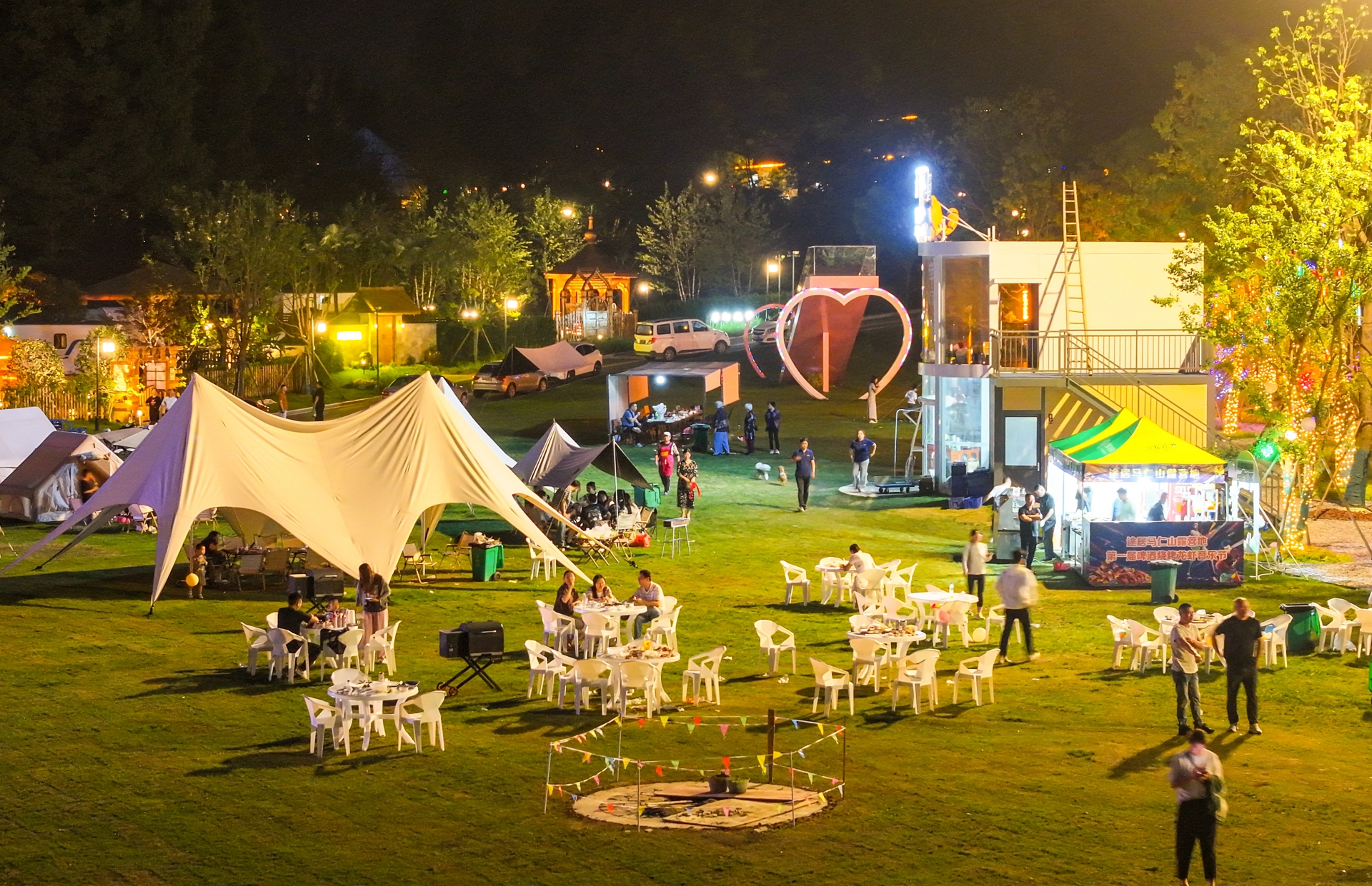 2024年6月1日,芜湖市繁昌区孙村镇中分村,途居马仁山房车露营地景区灯火通明,游人如织,优美的乡村生态环境吸引众多游客前来游玩。