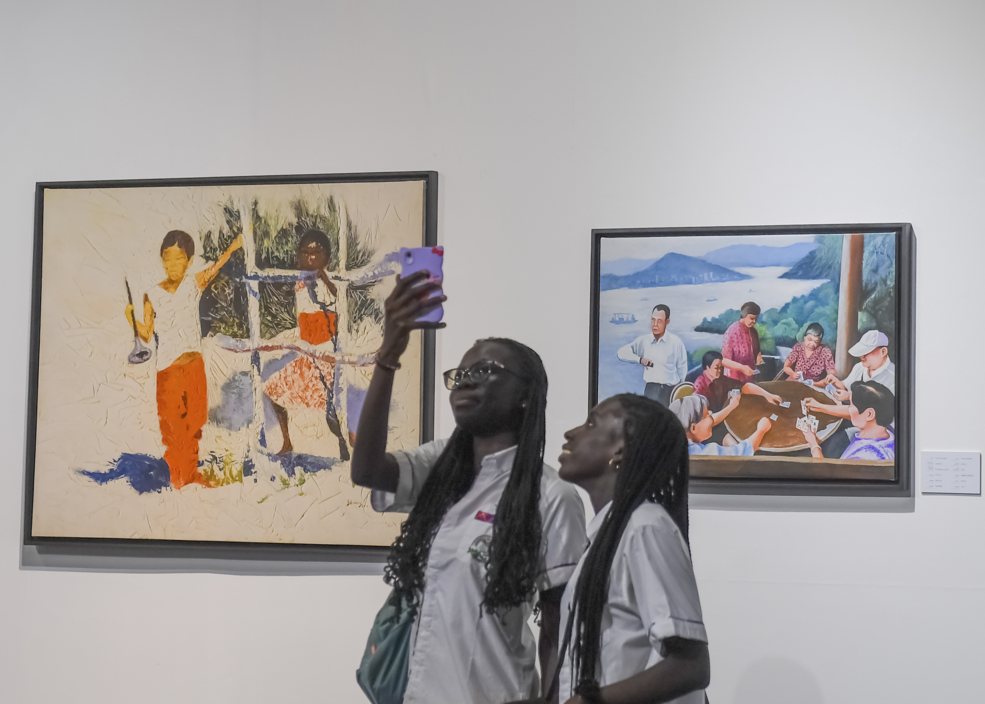 2023年5月12日,游客在塞内加尔首都达喀尔的黑人文明博物馆与展出画作合影。“隔洋相看——非洲画家笔下的中国”画展5月12日在这里开幕。新华社记者 李亚辉 摄
