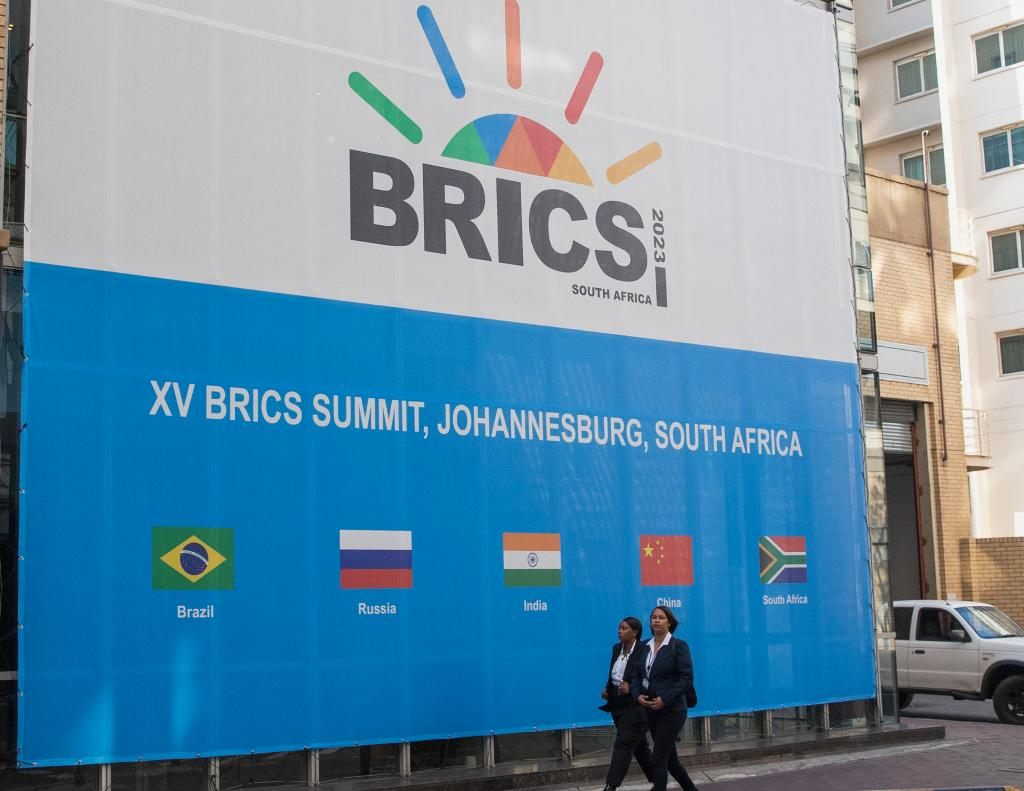 2023年8月21日,在南非约翰内斯堡,行人走过金砖国家领导人第十五次会晤举办场所桑顿会展中心。新华社记者张誉东摄