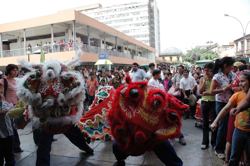 2006年1月28日,在秘鲁首都利马市中心的唐人街上,华侨舞狮团正在进行舞狮拜年活动。新华社记者摄