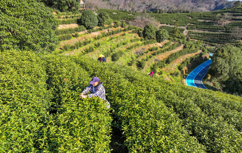 2025年3月17日,庐江县柯坦镇虎凹茶园,茶农正在采摘春茶。连日来,随着气温回升,合肥市庐江县各茶园开始采摘“明前茶”,茶农纷纷抢抓时节采摘春茶供应市场,茶园的“绿叶子”变成群众增收致富的“金叶子”。