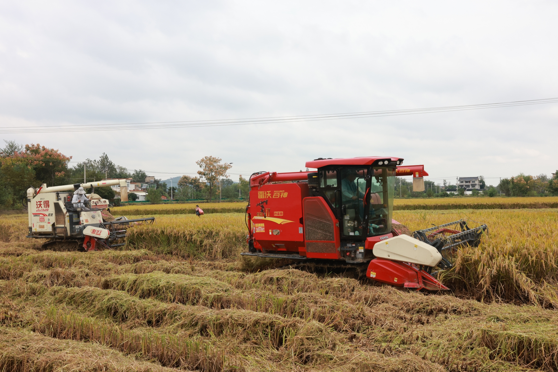 在山河种植基地,广袤的田野如同披上了一层金装,沉甸甸的稻穗压弯了稻杆,阵阵微风卷起金色波浪。3台小型水稻收割机正开足马力往返穿梭,所到之处,水稻尽数倒下,切割、脱粒、秸秆打捆回收利用等工序一气呵成。种植大户杨才玉看着高效快捷现代化的机械作业,赞叹不已。随着颗粒饱满的稻谷从收割机出口输出,自动卸入等待装稻谷的车中,一辆辆运输车将稻谷送到车间进行烘干收储。按照他的计划,预计10月底就能收割结束。