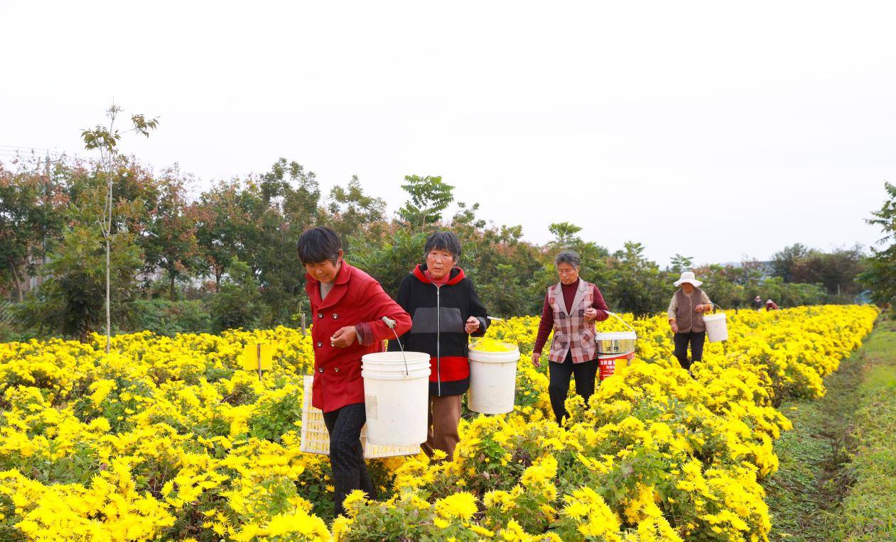 “从4月育种到10月采收,一朵菊花要经历近半年的精心管护。”基地负责人介绍,金丝皇菊亩产可达2000至3000斤,每亩收益稳定在1.5万元左右。采收高峰期,每天需要约70名工人,本村留守妇女和中老年人成为主力。“在家门口干活,一天能挣70块钱,还不耽误照顾家”,村民们话语间洋溢着满足。