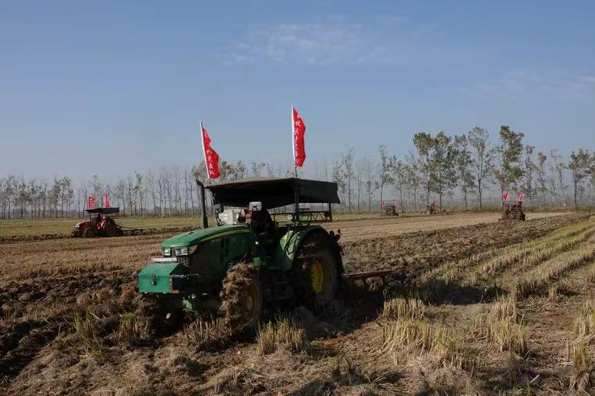 多辆旋耕机在旋耕农田。(周晓璐 摄)