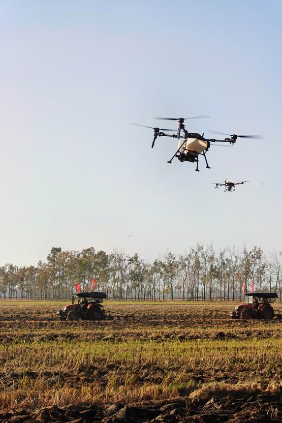 临淮岗镇临闸村,无人机配合旋耕机进行空中施肥。(周晓璐 摄)