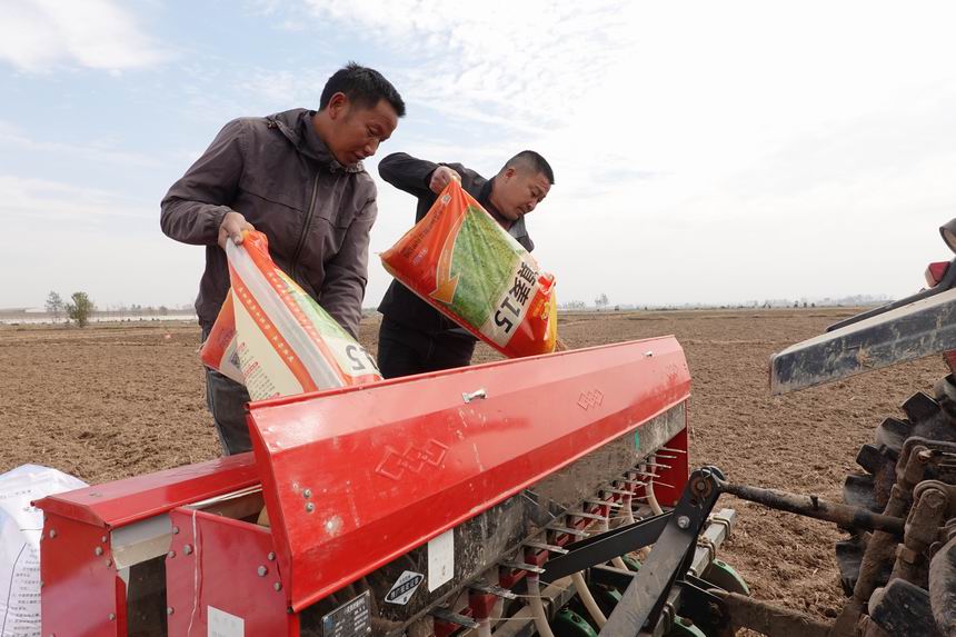 在城西湖乡王台村,种肥同播机在田间穿梭,村民抢抓晴好天气加快播种。农技人员也深入田间,指导农户科学应对湿渍晚播的不利条件。