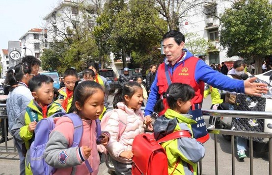 北苑村社区安居巡逻队队员在琥珀小学(东区)门前护送学生上学