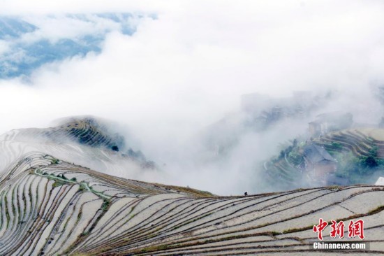 11月17日,广西龙胜各族自治县龙脊梯田云雾缭绕,美不胜收。初冬时节,位于该县大山深处的龙脊梯田蓄水充盈,吊脚楼、梯田和群山若隐若现,构成一幅幅醉人的美丽画卷,吸引众多中外游客和摄影爱好者前来游览拍摄。 吴生斌 摄