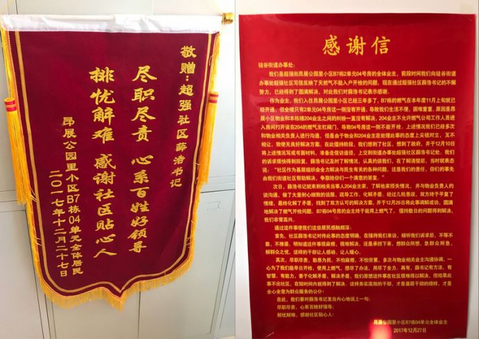 1月2日,昂展公园里小区居民代表为感谢超强社区心系居民,为居民排忧解难,将锦旗和感谢信送到硅谷街道党办,对超强社区党总支书记薛浩为居民办实事,解决小区天然气开栓问题表示由衷的感谢。