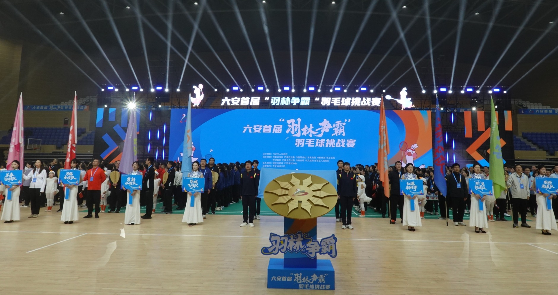 开赛仪式在庄严的国歌声中拉开帷幕。各参赛代表队方阵在创意十足的队旗引领下依次入场,霍邱县“蓼城飞羽”、金寨县“红源羽林军”、霍山县“霍斛仙羽”等队名巧妙融合了地方历史、红色文化与特色产业,展现了六安深厚的文化底蕴与地域魅力。随后,运动员与裁判员代表分别宣誓,承诺将恪守体育精神,公正执裁。