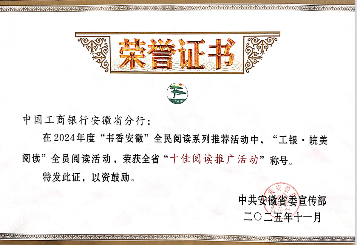 书香致远,墨卷至恒。展望未来,工行安徽省分行将以此次获奖为新起点,坚守“为员工成长赋能、为企业发展聚力”的初心,持续深化“工银·皖美阅读”品牌建设,致力于让书香更深融入经营管理血脉,进一步推动阅读与金融科技、业务创新、客户服务相融合,提升时代感与吸引力。