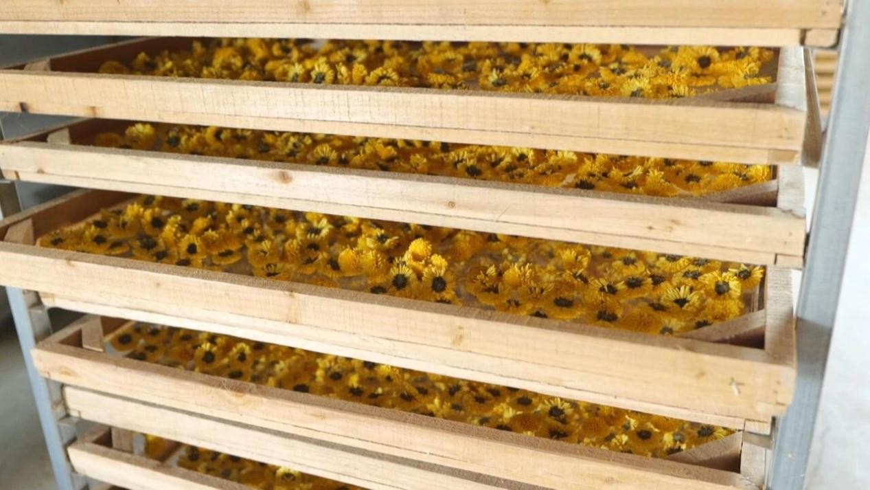 杨新建介绍:“鲜菊花保质期短,常温下放一两天就会变质。我们专门引进了4台智能烘干设备,能精准控制温度和湿度。不仅效率提高了,还能最大程度保留菊花的香气和营养。而且烘干后价格也有所提升,从鲜菊花的几块钱一斤增加到百十块钱一斤,销路也增加了。”