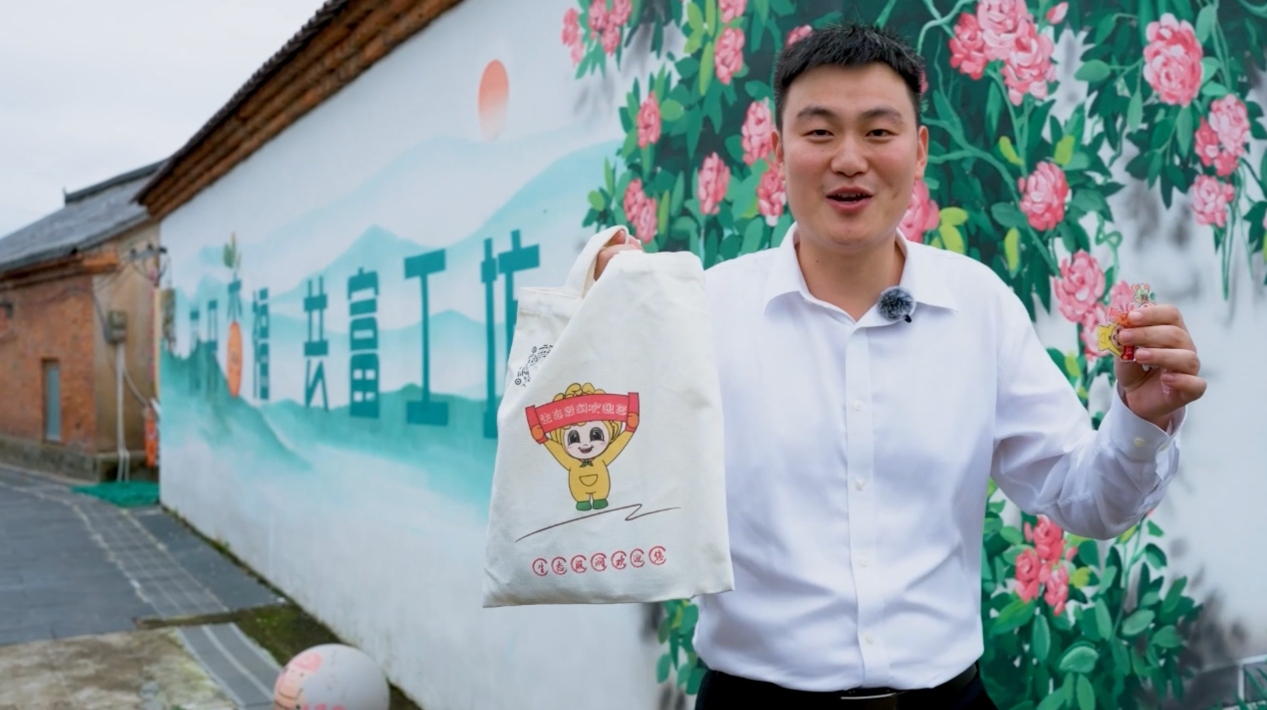 在村委会前的广场上,王世义站在“小杏福”IP形象旁,手持文创钥匙扣和帆布包向观众展示。“这是我们‘花开杏福’共富工坊结合卸店文化打造的IP形象——‘殷小菊’和‘小杏福’。”这些可爱的形象,正是传统文化与现代创意碰撞的结晶。