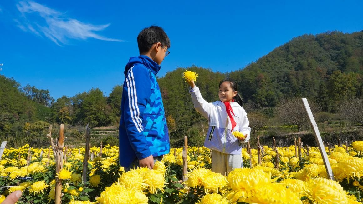 “酒香也怕巷子深”,为让石河村的菊花“走出深山、香飘四海”,驻村工作队化身新媒体“弄潮儿”,当起菊花产业的“宣传员”和“代言人”。他们举着手机穿梭在花海,镜头里有菊花绽放的娇艳、村民劳作的热忱,也有孩童嬉闹的天真。“黄山脚下藏花海,金丝菊香等你来”“泡一杯石河菊,品的是茶香,暖的是乡愁”……这些接地气的短视频带着山乡温情,在网络上迅速走红,不仅引得来各地游客“打卡”,更让批发商主动上门抢单,石河村的菊花名气越来越响。