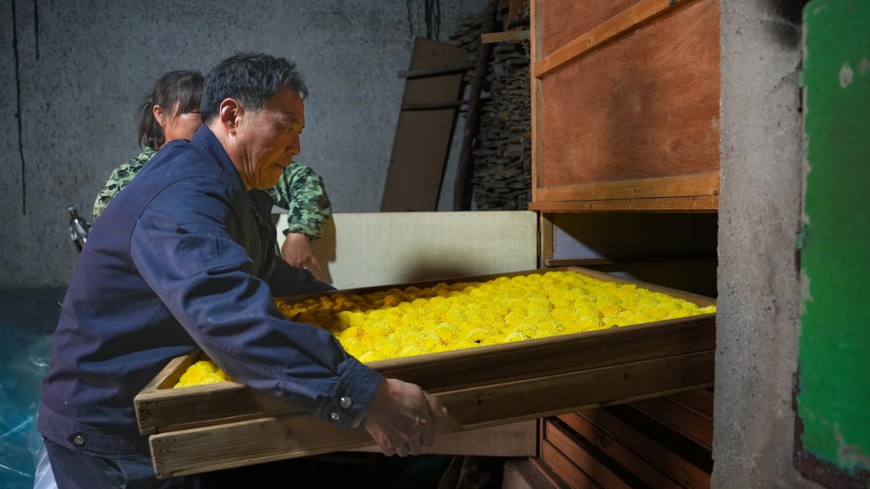 村民在自家烤房烘烤菊花