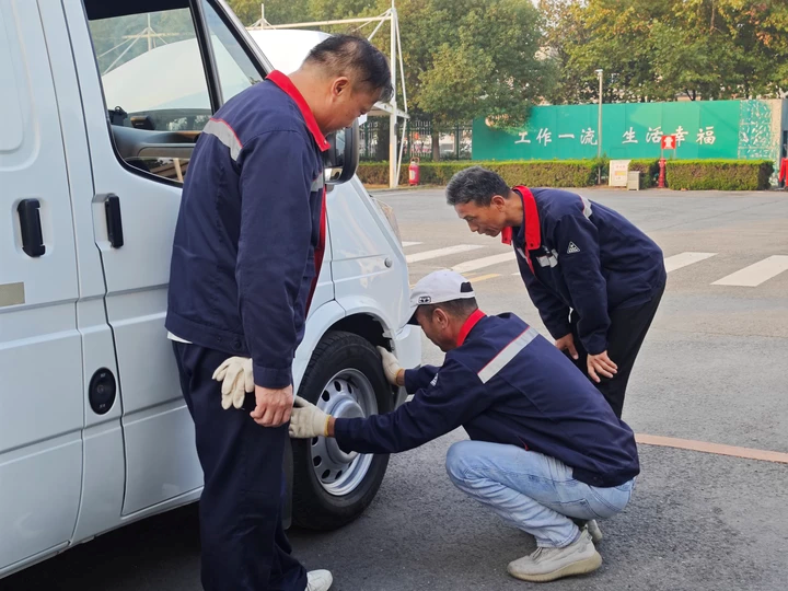 驾驶班组正在检查轮胎使用状况