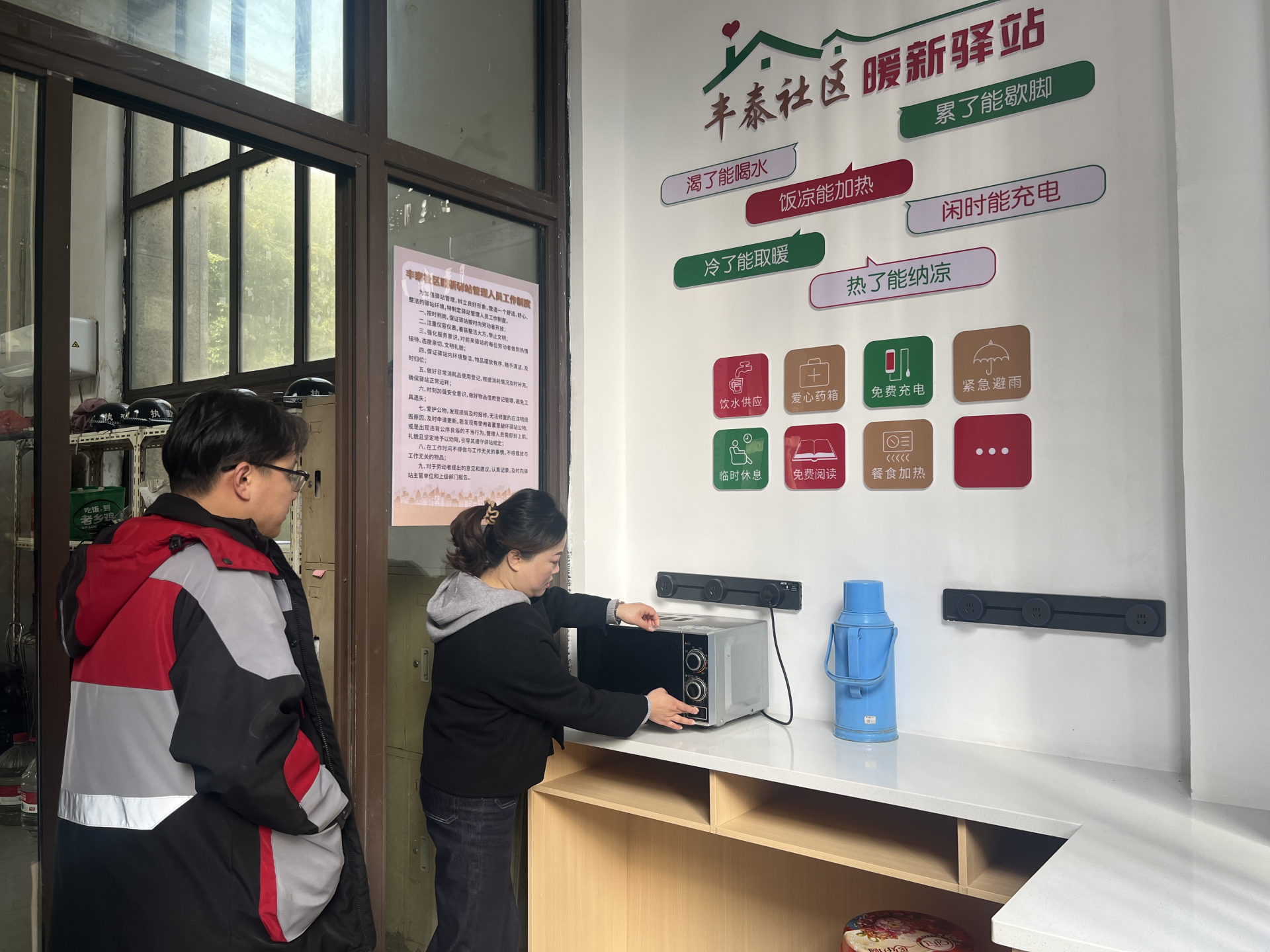 针对走访梳理出的核心诉求,在社区资金紧张的情况下,小区党支部盘活现有资源,将南门门卫室闲置用房进行改造升级,打造出1处功能齐全的“暖新驿站”。驿站内划分休息区、充电区、物品暂存区,配备舒适座椅、手机充电桩、饮水机等基础设施,还特意添置微波炉,方便骑手加热自带餐食。同时,党支部在驿站内放置创可贴、解暑药、消毒用品等免费应急药品,为骑手健康保驾护航。一个小小的驿站,不仅切实解决了骑手的日常难题,更让奔波在外的他们感受到社区的关怀与温暖。