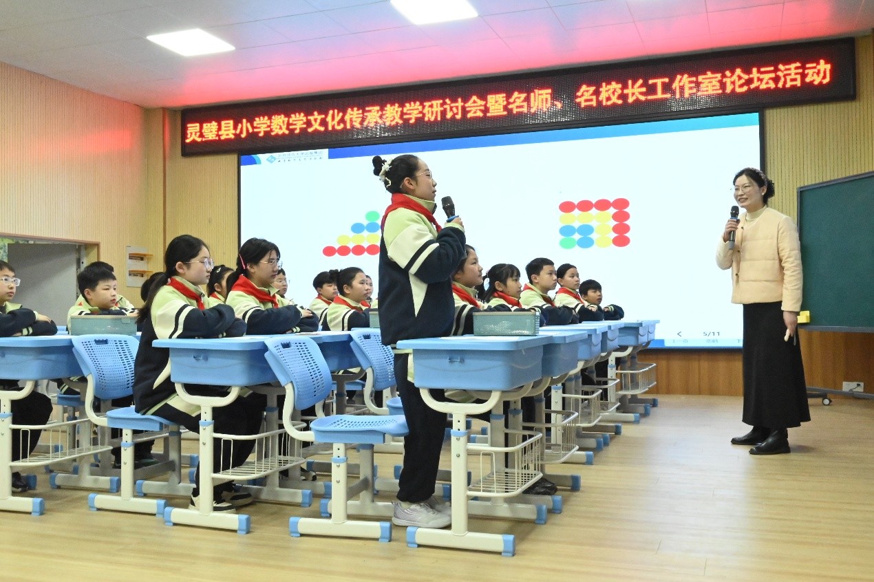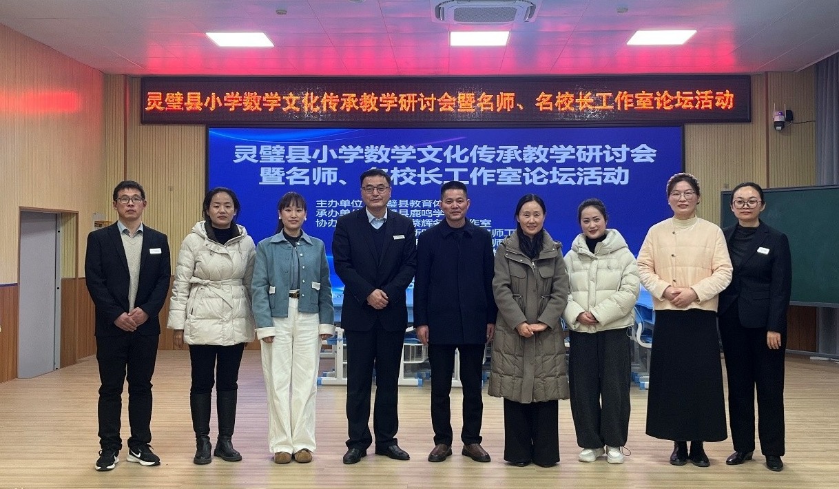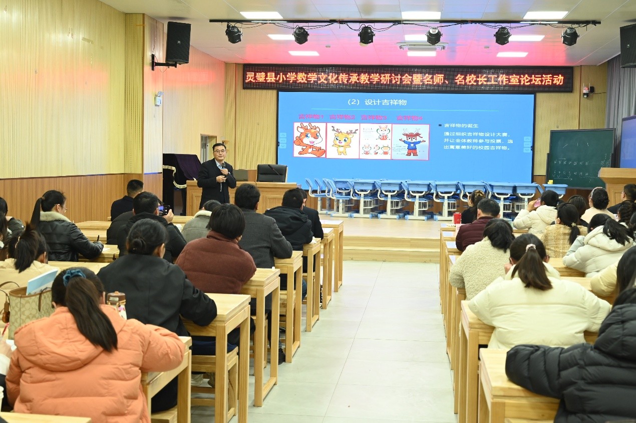 为深化小学数学课堂教学改革,推动数学教育与文化传承深度融合,12月11日,由灵璧县教育体育局主办、灵璧县鹿鸣学校承办,合肥市蔡辉名师工作室、安徽省新时代方少杰名师工作室、安徽省新时代王士永名师工作室、安徽省新时代崔少华名校长工作室、安徽省新时代徐计峰名校长工作室协办的“小学数学文化传承教学研讨会暨名师、名校长工作室论坛活动” 在安徽省宿州市灵璧县鹿鸣学校成功举办。该县所辖各中心学校、县属小学业务副校长、数学骨干教师及各协办工作室核心成员齐聚一堂,以“实践展示—理论引领—价值解码—经验共享 的闭环教研模式,共话数学文化教学新路径。