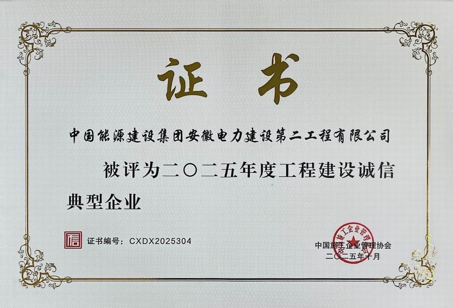 近日,中国施工企业管理协会正式发布《2025年度工程建设诚信典型企业名单》,中国能建安徽电建二公司榜上有名,获评“2025年度工程建设诚信典型企业”。