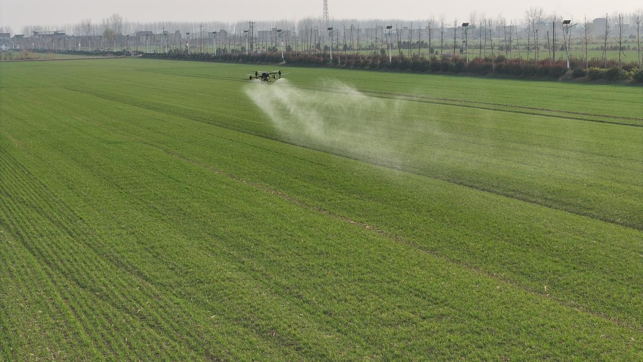 “嗡嗡嗡……”伴随着植保无人机的轰鸣声,一架架满载着“营业液”的无人机在麦田上空灵活盘旋,细密的肥液均匀地洒落在绿油油的麦苗上。通过精准喷施磷酸二氢钾、水溶肥与复硝酚钠混合液,有效地促进了小麦提苗、生根与分蘖,为夏粮丰收打下扎实基础。