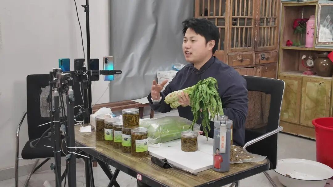 曾在外地从事直播行业的张奉献,看到家乡农产品发展的潜力,毅然返乡创业。“刚开始回家时只是收购农产品鲜菜在网上售卖,后来村里面提供了场地、设备和农户资源,我们的业务迅速扩大。”村民张奉献回忆道。他的直播团队从最初的3人发展到现在的15人,吸收的全是本村的待业青年,月销量也从一开始的1万单增长到了20万单,上个月销售额更是突破了400万元。