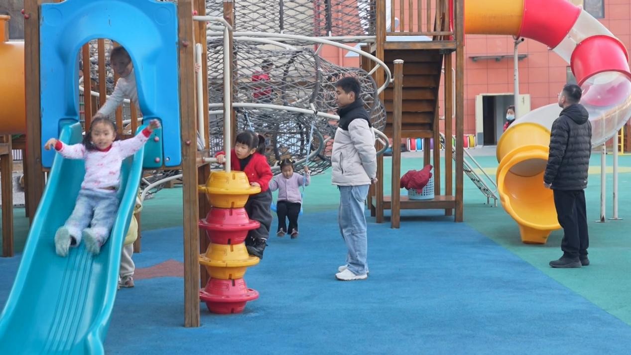 幼儿园的小朋友在老师的看护下,体验滑梯等园内设施(赵宇 摄)