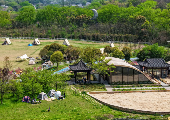 景区的草坪上,一顶顶帐篷错落有致地排列着,五颜六色,宛如一朵朵盛开的花朵。游客们三五成群,或围坐聊天,或品尝美食,或躺在草地上晒太阳。孩子们在草坪上奔跑嬉戏,风筝在空中随风飘扬,整个露营区洋溢着轻松惬意的氛围。