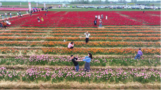 随着元辉农业种植基地里的郁金香大面积盛开,一场“春日淠东 ‘郁’见西施”的郁金香观赏季浪漫启动。时值中小学生春假和清明节连休,假期里前来赏花打卡的游客络绎不绝,游客穿行于各色郁金香的花海之中,感受着“人在花中,花在景中”的春日浪漫和惬意。