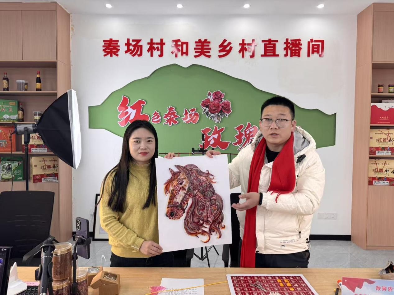 非遗盘纸传承人姜守云在直播间展示作品《马》(王晨晨 摄)