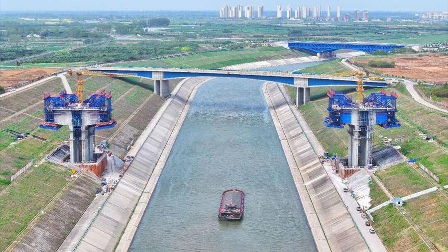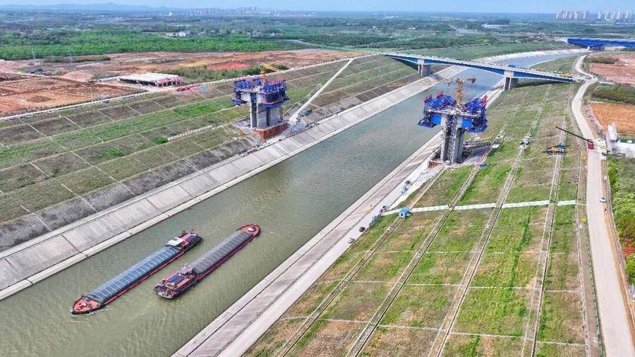在引江济淮工程合肥市蜀山区小庙镇街北村段,淮桐高速合肥段引江济淮特大桥建设现场传来阵阵机器轰鸣声。南北主墩施工顺利,建设者正全力开展主梁上部结构挂篮悬臂浇筑施工。