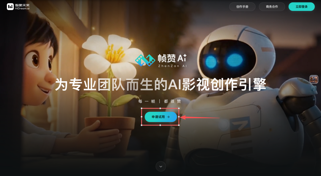 第1步:进入“帧赞”官网首页,点击“申请试用”;