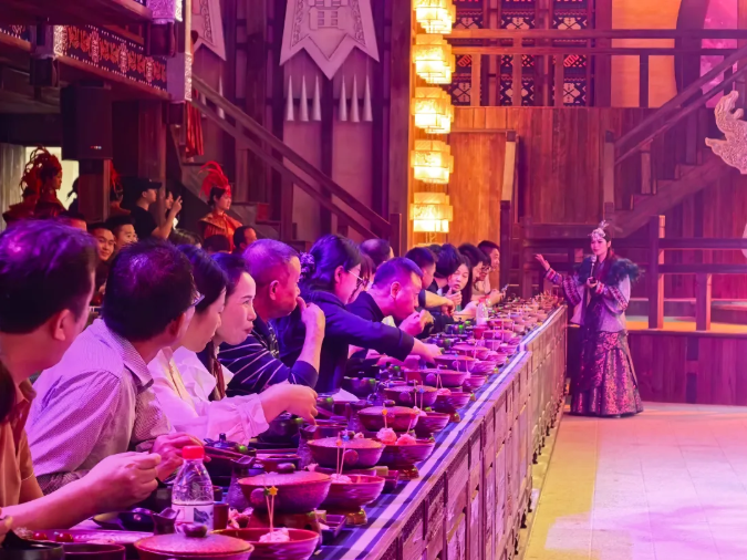 此外,“畲月宴”剧场内灯火璀璨,宾客沉浸式品味畲族特色美食,同步欣赏歌舞演艺,开启味觉与视觉的双重盛宴。