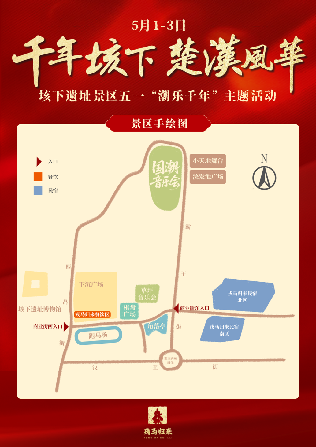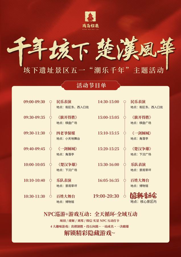 自五月一日开始,固镇垓下景区将举办为期三天的沉浸式《梦回垓下·日夜有戏》楚汉风云国潮电音节,活动将采用古典乐器与电声乐队创新融合的形式,通过四大篇章和十五首曲目展现楚汉风韵的独特魅力,为观众提供一场古今融合的视听盛会。“楚歌扬·壮志启程”篇以《十面埋伏·楚汉雄风》《沧海一声笑》燃情开场,电音乐队将配合激情演绎《爱江山更爱美人》《精忠报国》经典曲目。“戎马归·故里情长”篇将演奏唢呐版《九儿》《谁与争锋》,以此呼应垓下故里的人文情怀,传递和平安定、万民欢聚的正向期许。