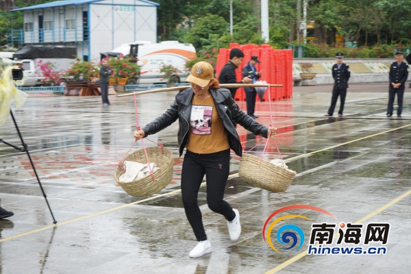 女队员参加“挑粮比赛”一路狂奔。南海网记者 姚少龙 摄